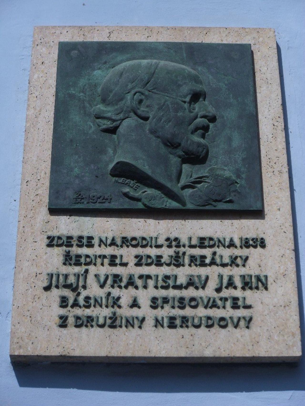 Jiljí Vratislav Jahn (1838–1902) byl autorem první učebnice chemie v českém jazyce a autorem řady dalších učebních a popularizačních textů k přírodním vědám. Absolvent chemického inženýrství dlouhá léta vedl jako ředitel pardubickou reálku a stal se váženou osobností nejen ve svém regionu. Byl kulturně i politicky činný, přispíval do Národních listů, Riegrova Slovníku naučného, stýkal se s básníky a spisovateli, od roku 1847 byl členem Českého zemského sněmu a roku 1885 byl zvolen do Říšské rady. V roce 1865 se mu narodil syn Jiljí Jaroslav, který se stal uznávaným geologem. Pamětní deska byla na místě bývalého rodnému domu Jiljí V. Jahna osazena v roce 1924 ku příležitosti všenárodních oslav J. V. Jahna v Pardubicích. Autorem desky je akademický sochař Miloslav Baše.
