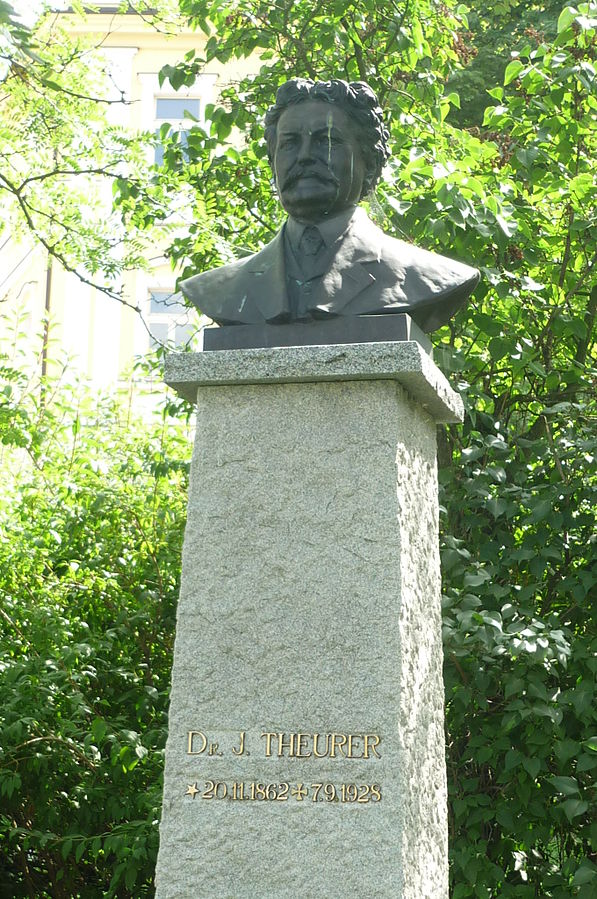 Josef Theurer byl muž mnoha vědeckých zájmů. Kromě geologie, matematiky a také hudební teorie a historie se ale do historie vědy nejvíce zapsal svými zásluhami o rozvoj experimentální fyziky při výuce geologů a budoucích horníků. Na jeho počest se město Příbram rozhodlo umístit bustu k místu jeho působení na dnešním Theurerově náměstí. V roce 1947 vznikl první model busty, ale nebyl umístěn. Po únoru 1948 bylo náměstí J. Theurera přejmenováno na Fučíkovo náměstí a Theurer si na svou bustu musel počkat až po revoluci v roce 1989. Na základě původního modelu busty zhotovené akademickým sochařem Václavem Šárou byla odlita bronzová busta a byla umístěná na kamenný monolit před budovami bývalé Vysoké školy báňské dne 13. října 2001 ku příležitosti oslav 150. výročí založení této školy.