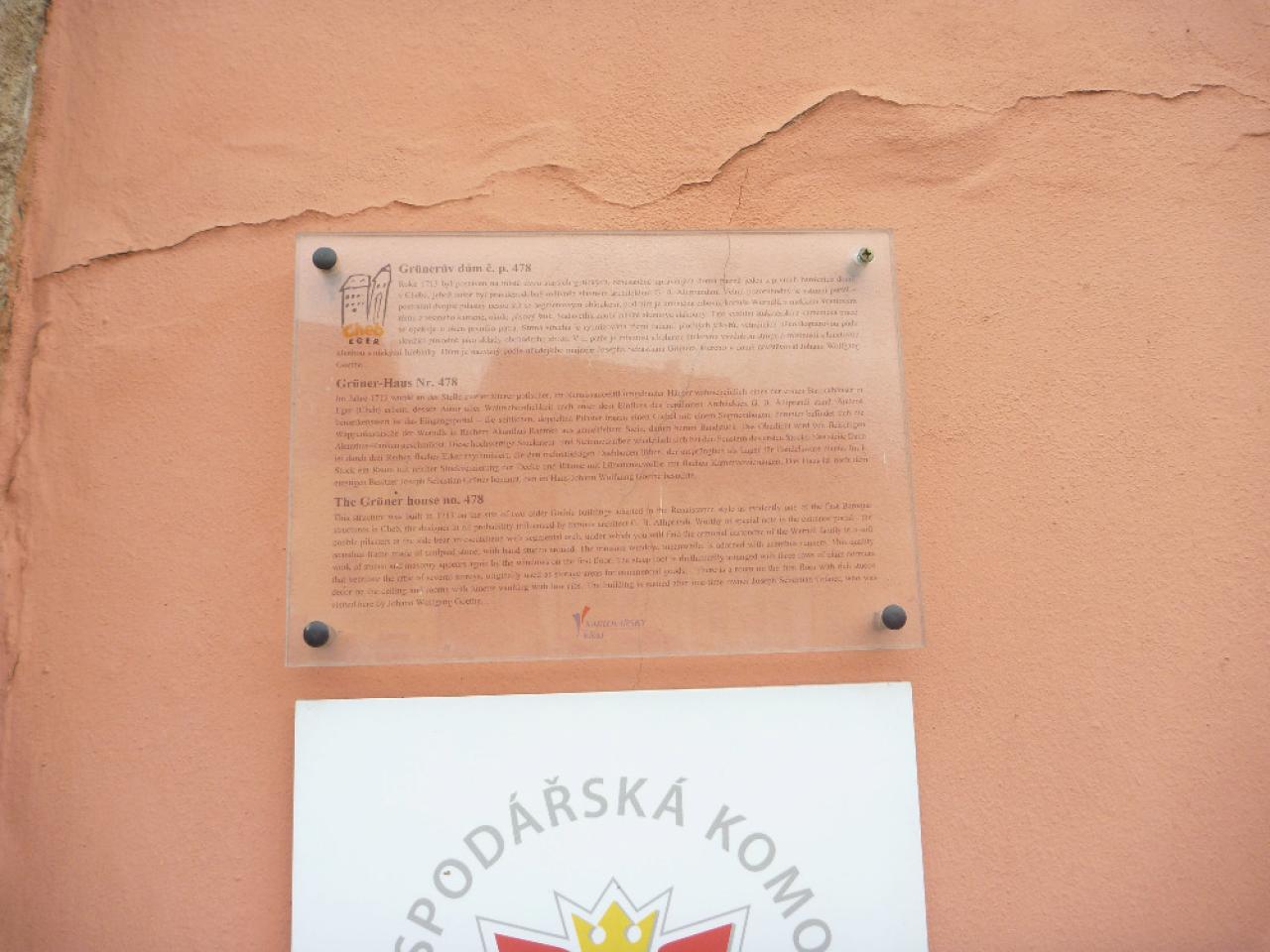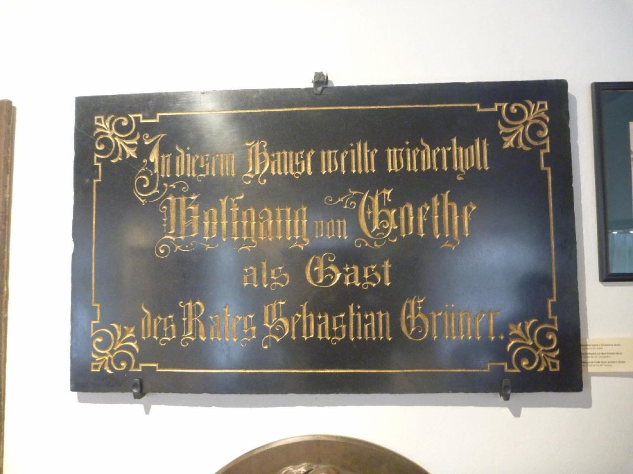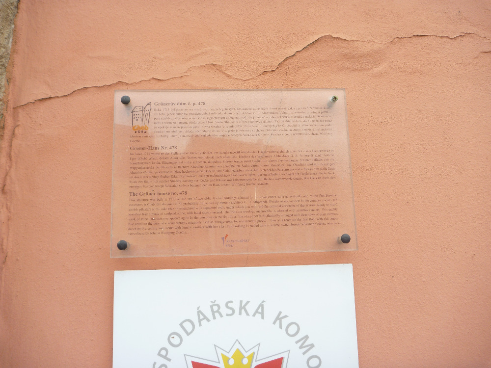 Na Grünerově domě byla z podnětu Spolku pro chebský národopis umístěna v roce 1899 tabulka s německým nápisem: V tomto domě pobýval opakovaně Wolfgang Goethe jako host rady Sebastiána Grünera. Deska zmizela koncem 80. let 20. století při rekonstrukci domu. Později byla objevena poničená a nalezla útočiště ve sbírkách chebského muzea. V současnosti informuje o historii domu nově osazená tabulka.