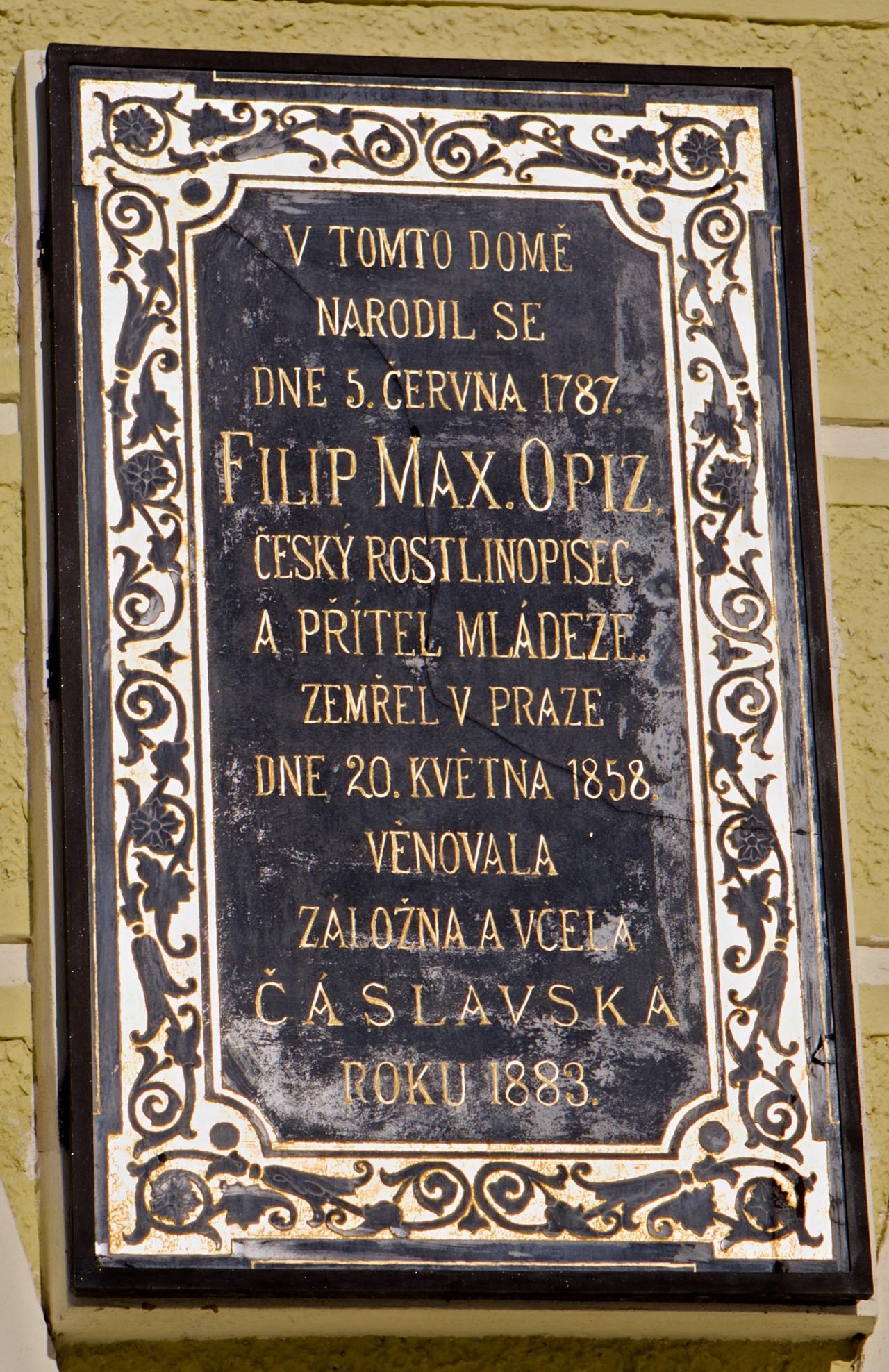 Pamětní deska byla na Opizově rodném domě v Čáslavi slavnostně odhalena z iniciativy archeologického spolku Včely Čáslavské dne 10. 6. 1883, a to za účasti zástupců všech čáslavských spolků, členů zastupitelstva i významných vědeckých osobností. Slavnostní řeč u této příležitosti pronesl universitní profesor, geolog Jan Krejčí.