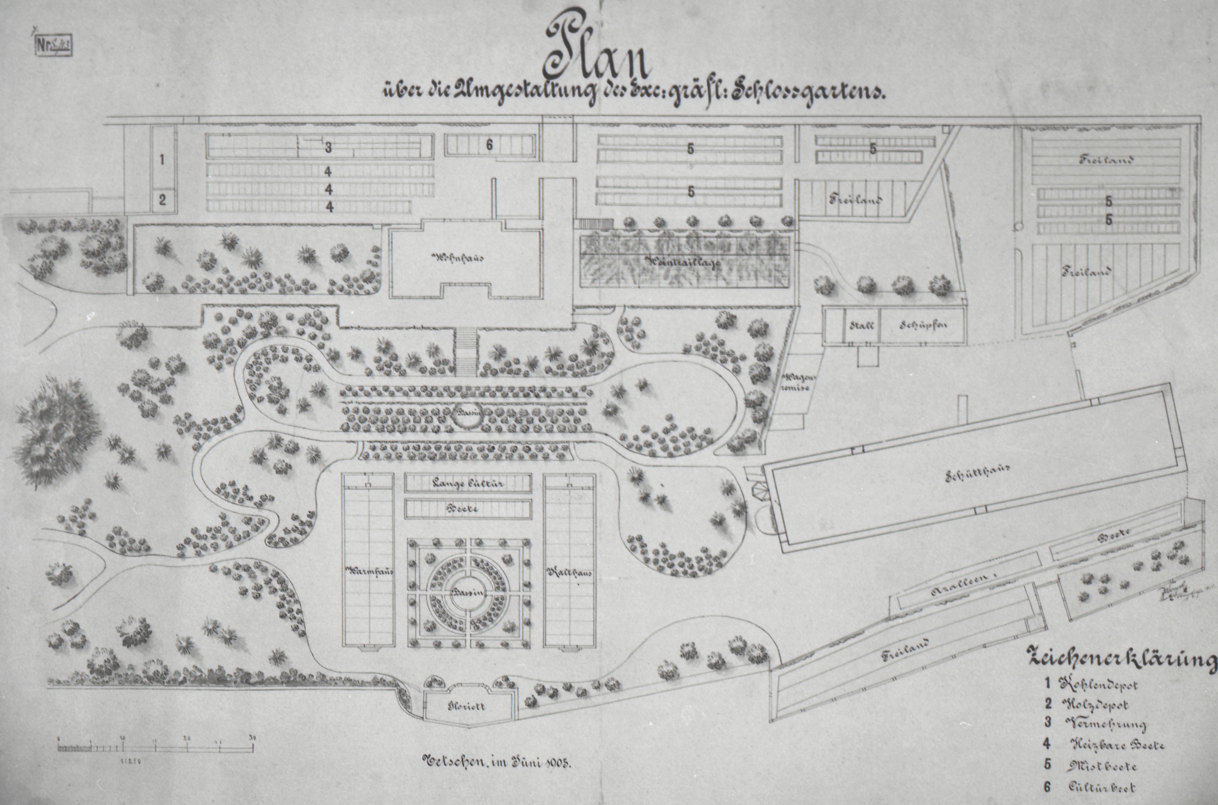 Work began to build the southern chateau gardens in the early 18th century. A Baroque pentagonal bastion was erected on the southern side of the chateau slope, planted with vineyards. The vast interior of the fortification system gradually filled up with flower beds, gardens and garden structures – greenhouses, an orangery and, in 1737, even a tea pavilion, lavishly decorated in the oriental style. At the beginning of the 19th century its owner, František Antonín Thun, had five terraces built, on which 18 heated greenhouses were gradually installed, used to grow orchids, camellias, pineapples, orange trees and other tropical plants. The gardens were at the height of their glory in the middle of the 19th century thanks to the work of the famous gardener Franz Josst, who succeeded in cultivating victoria regia, the largest tropical water lily in the world. It was here in the gardens of Děčín Chateau that the victoria flowered for the first time in the Habsburg monarchy and probably throughout continental Europe in 1852. The fame of the gardens was closely linked to the gardeners Franz Josst, his son Franz Josst Jr. and Benedikt Roezl, a prominent traveller and orchid connoisseur, who studied in Děčín under Josst. After the tragic death of Franz Josst in December 1862 and after the death of his son in 1905 the renown of the Děčín gardens began to wane. The definitive end came for the southern gardens after Děčín Chateau was sold to the Czechoslovak army in 1932. The Czechoslovak soldiers had all the greenhouses removed and built a drilling ground and new stables on the lowest terrace, with warehouses and garages later added. From 1968 the chateau was occupied by the Red Army, which resulted in its total devastation. After the soldiers left in the early 1990s extensive restoration work commenced, the final stage of which was the renovation of the southern gardens, which were opened in 2013.