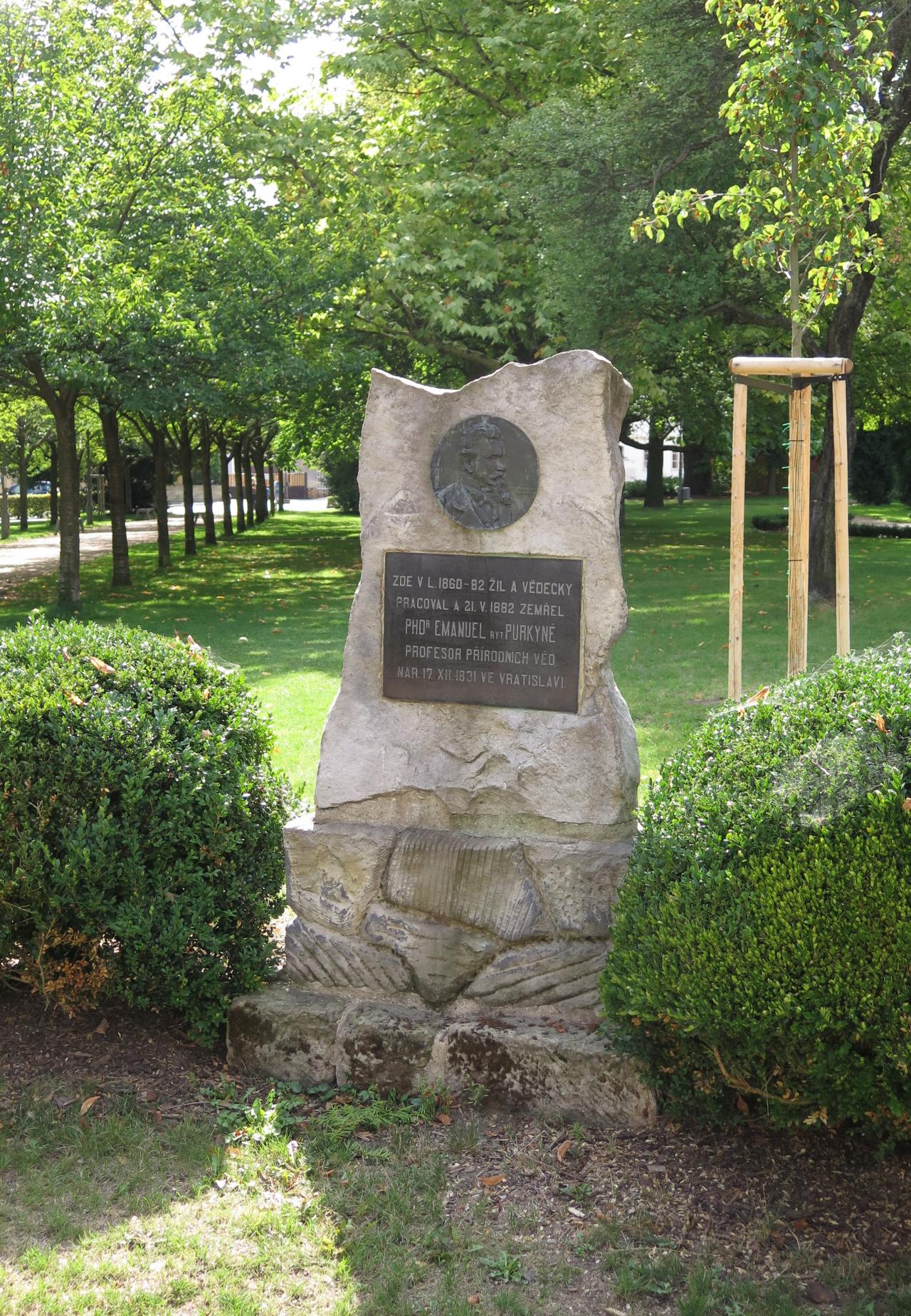 The memorial plaque on the northern side of Masarykovo náměstí in Bělá pod Bezdězem at the edge of the park commemorates the knight Emanuel Purkyně (1831–1882), a prominent botanist and forester, who worked as a secondary school teacher in Bělá pod Bezdězem.
