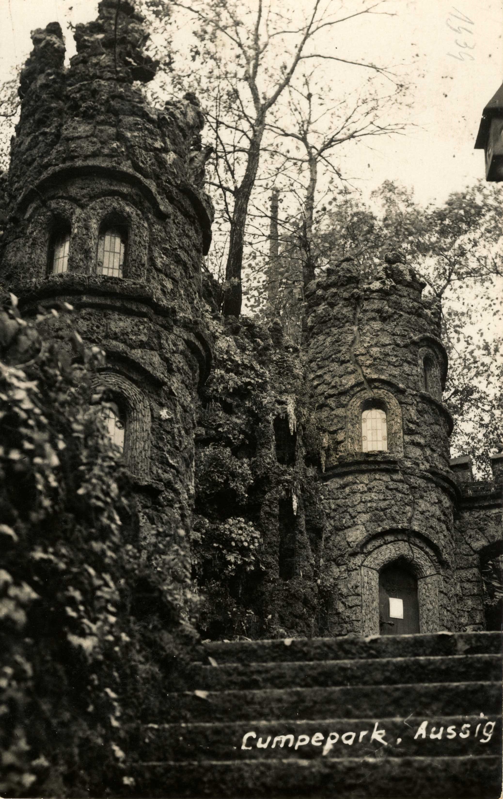 The “Lumpepark” was the first birdlife reserve in Central Europe, established by the wholesaler and patron Heinrich Lumpe in Ústí nad Labem. Lumpe purchased three hectares of land in the middle of the industrial town and, at great expense, turned that inhospitable place into an Eldorado for birdlife. He had several hundred truckloads of fertile soil brought in and dumped on the rocky slopes, in which he planted thousands of plants, trees, shrubs and flowers. Garden artists from Bohemia and Germany assisted in the work. He diverted a spring onto the land, which fed the little streams, ponds, fountains and water jets. One crucial part of the project was erecting fencing and installing a variety of barriers to keep out cats and other predators. The work culminated in 1914, when the most attractive features of the site were installed – Henry’s Castle (Heinrichsburg) and the caves (Grottos). Both of these had a unique appearance due to the unusual material – they were built from limestone containing the remnants of fossils.