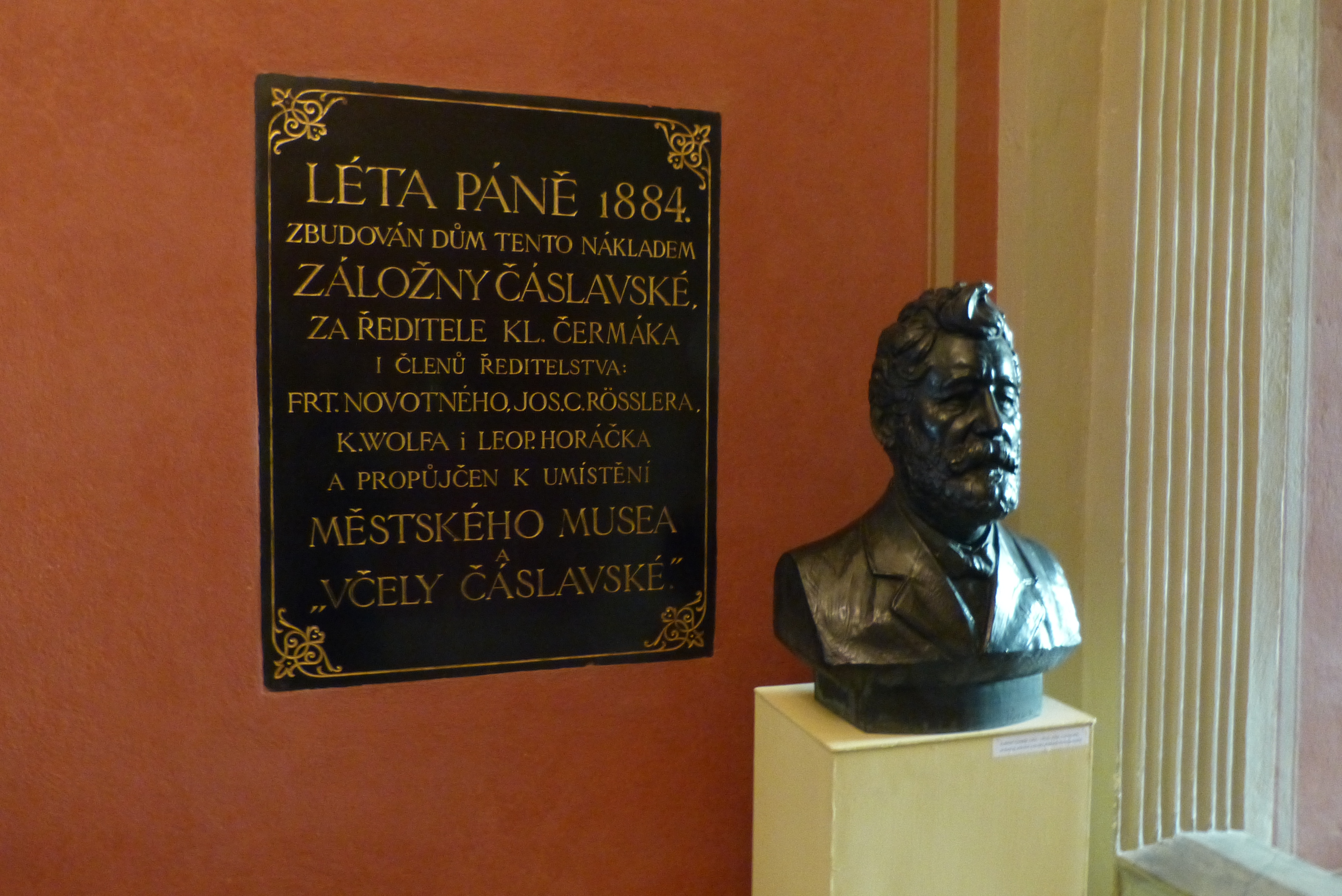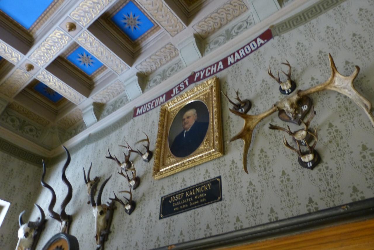 The grand museum building was opened in 1885. The natural sciences collections it houses include around a thousand exhibits, a considerable number of which were donated by Včela Čáslavská. A large number of valuable exhibits were donated to the Museum by the patron Josef Kaunický (1820-1908). Born in nearby Černín, he trained as a carpenter. He focused on engineering and piano mechanics; travelling through Vienna, Budapest and Hamburg, he arrived in London, where he achieved great success and became very rich. Also, while he was in London he became greatly interested in the natural sciences, visited museums and attended lectures, and also became acquainted with the work of Charles Darwin. He used his savings to buy some very well stuffed zoological specimens, which he donated to the town.