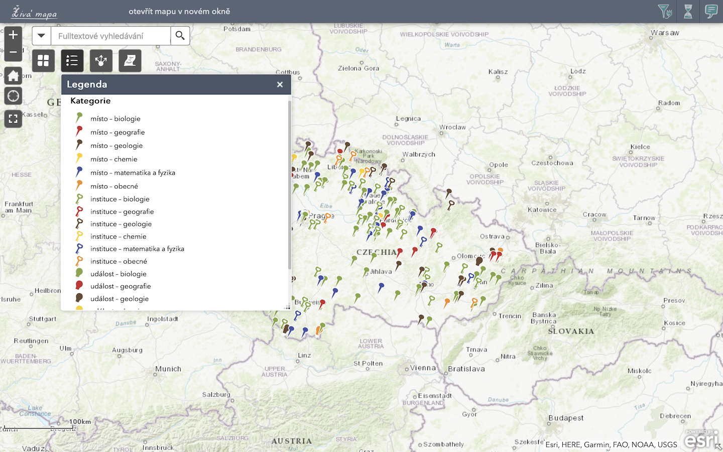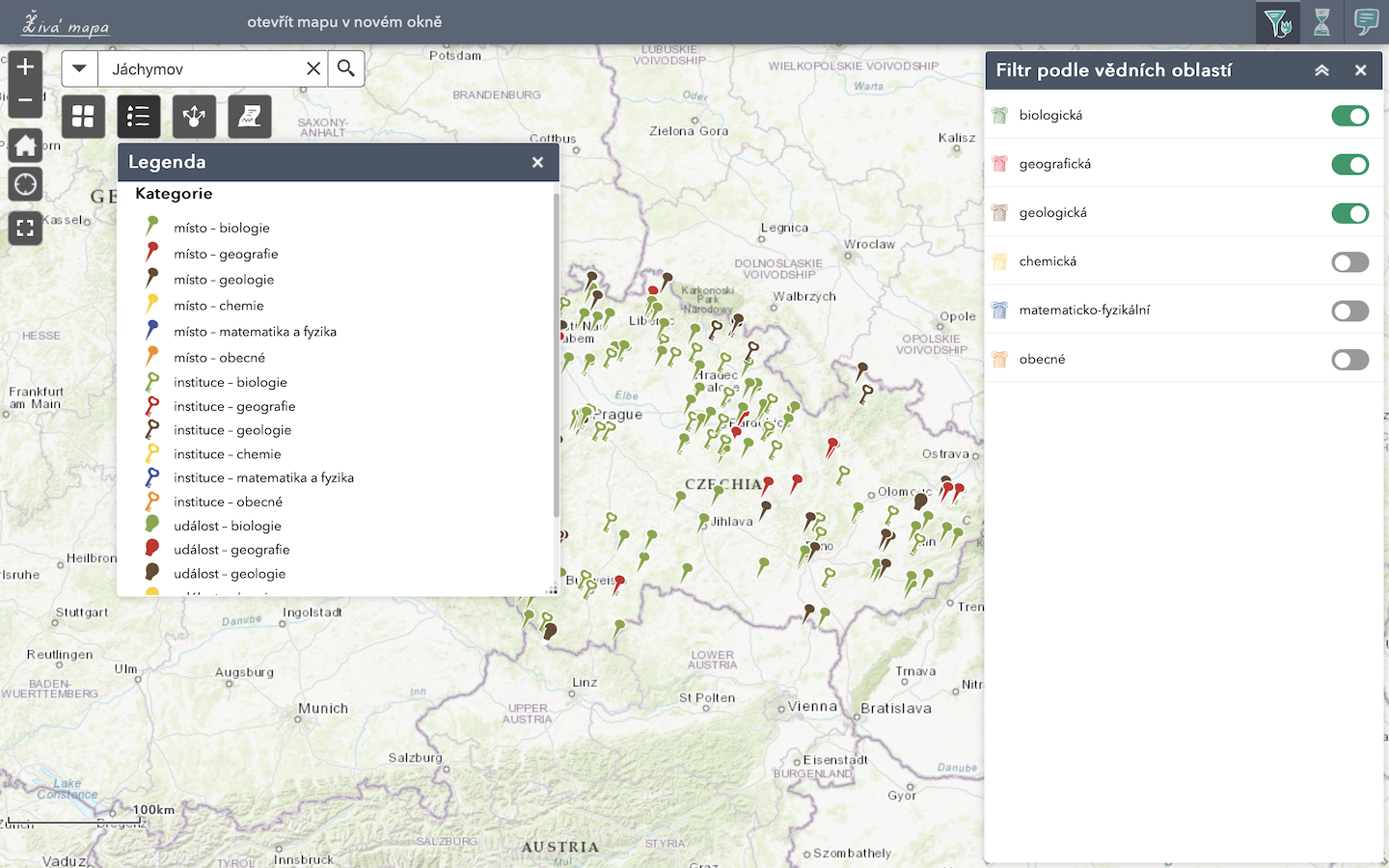 V aplikaci Živá mapa je možné přímo vyhledávat konkrétní body, ty jsou rozlišeny barevně dle oborů a též podle typu (místo, instituce, událost). Legenda se zobrazí kliknutím na příslušnou ikonu.