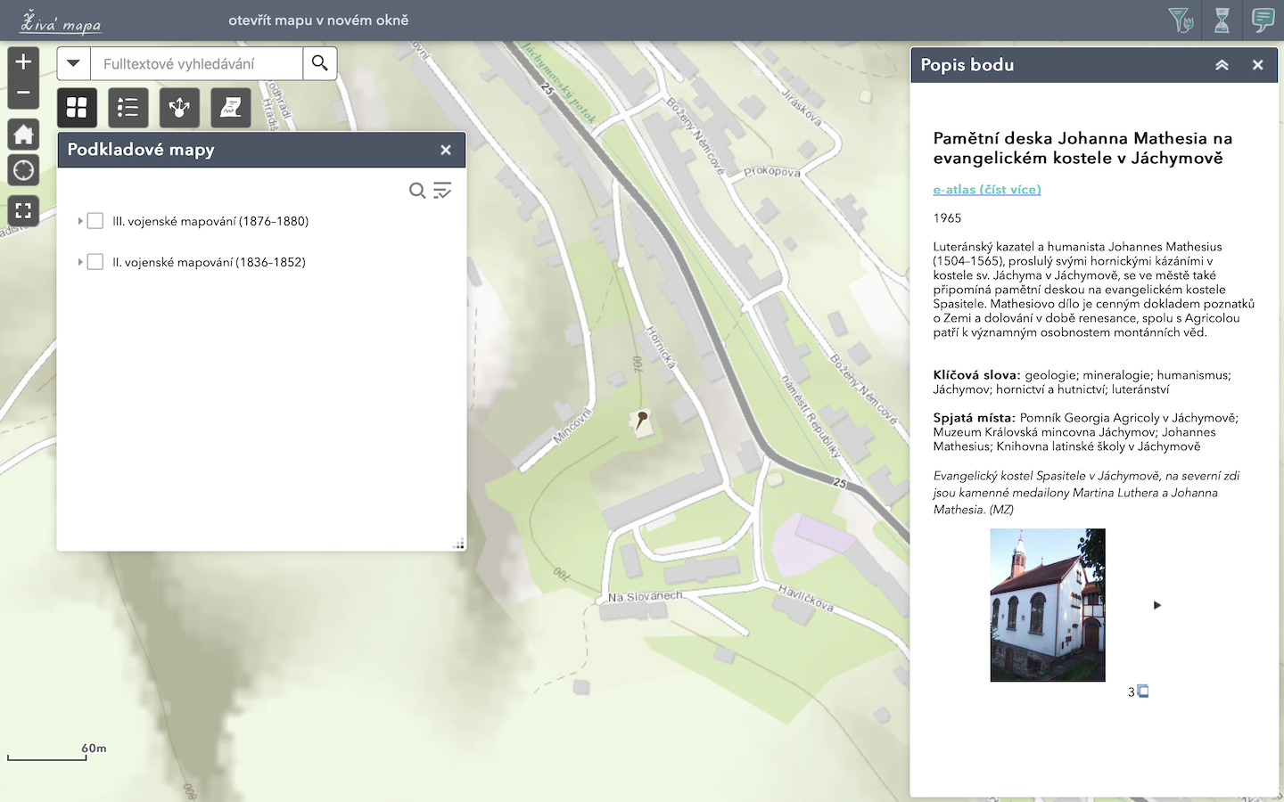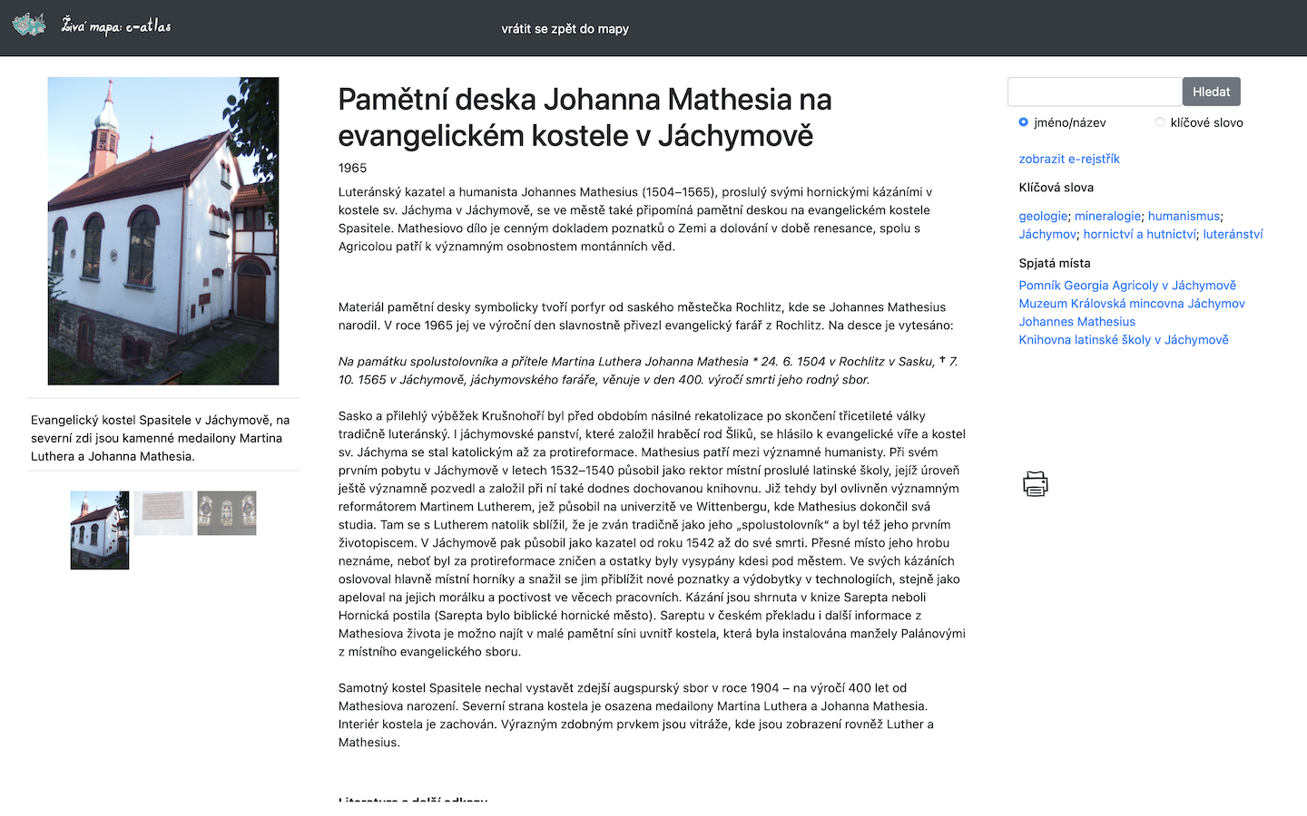 Základní popis bodu obsahující stručnou anotaci, klíčová slova a fotografii se zobrazí ve vlastním okně po kliknutí na vybraný bod. Rozkliknutím odkazu na e-atlas v tomto okně se zobrazí podrobné informace a další spjaté záznamy: