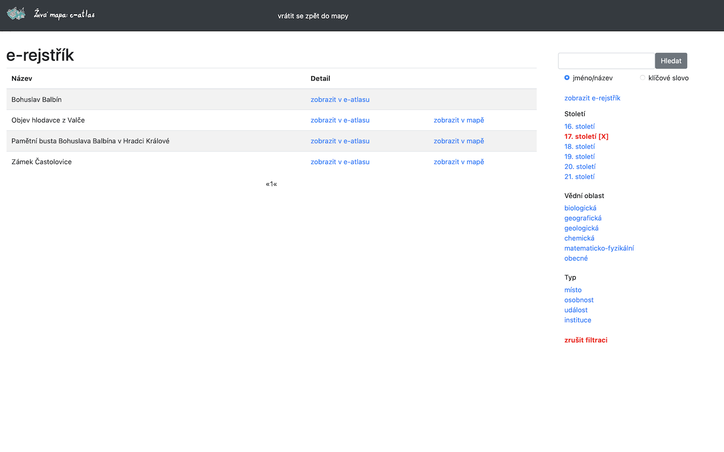 E-atlas je možné prohlížet i nezávisle na mapě a vyhledávat v něm dle klíčových slov a nastavení filtru. Po zadání hledaného slova (klíčového či z názvu) do okna vyhledávače se zobrazí e-rejstřík: